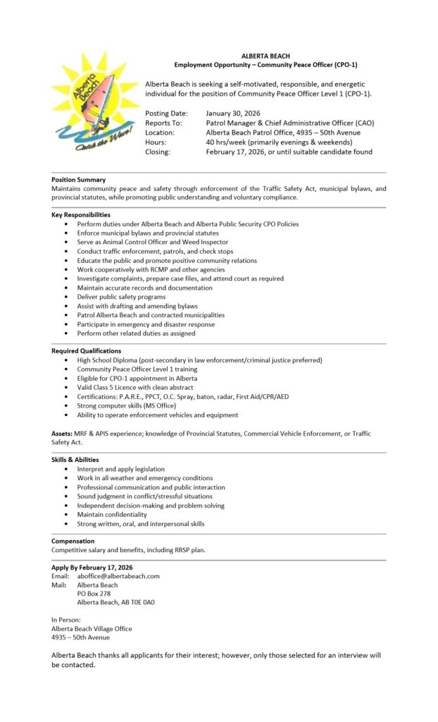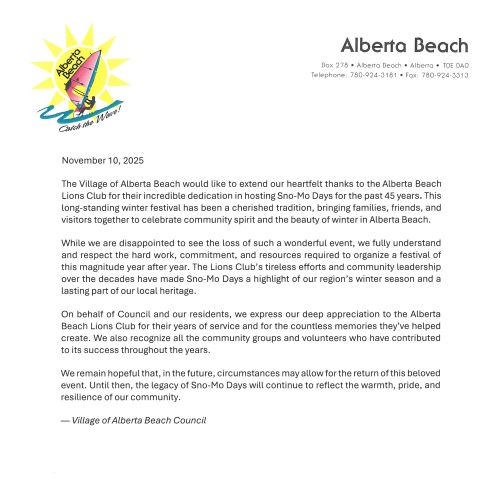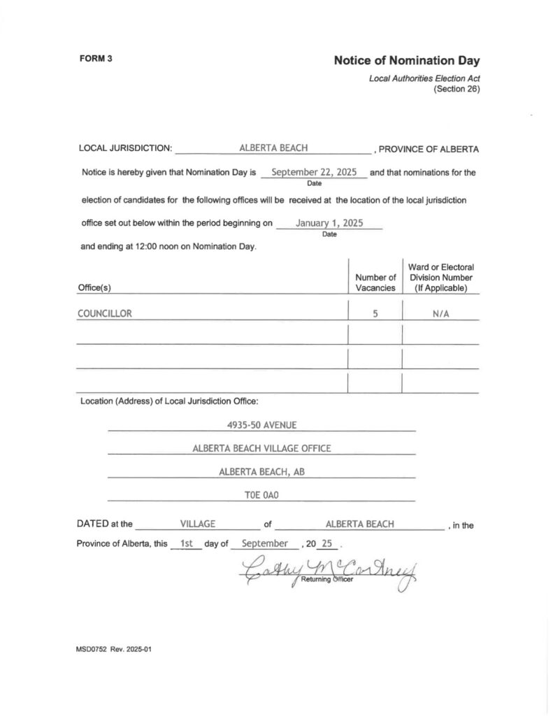 Please be advised that Nomination Day for the Village of Alberta Beach concluded on September 22, 2025. At the close of nominations, five (5) nominations for the position of Councillor were received and duly accepted by the Returning Officer.