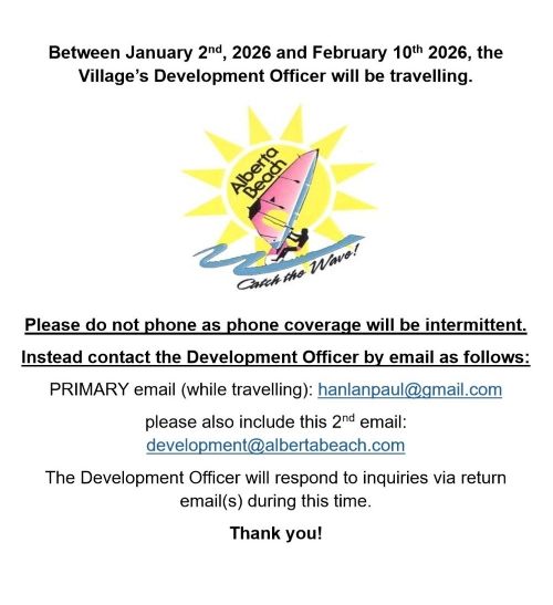 For Regular Council Meetings if you wish to address Council on a certain subject, please email your request to aboffice@albertabeach.com or call 780-924-3181 to schedule attendance as a delegate. Include your name, email address, and a brief description of what you would like to address Council on. You will need to contact the village office by 4:00 P.M. on the 2nd Thursday of the month to be included in the next Council meeting agenda, the following Tuesday.