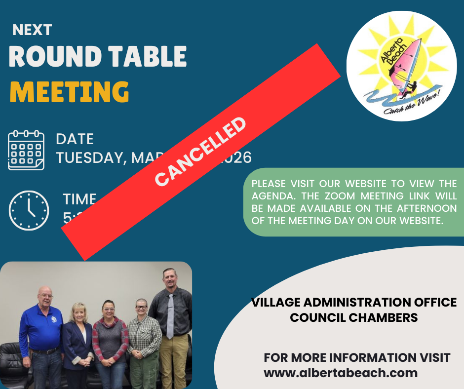 Please be advised that the Round Table Meeting scheduled for Tuesday, March 10, 2026, has been cancelled.